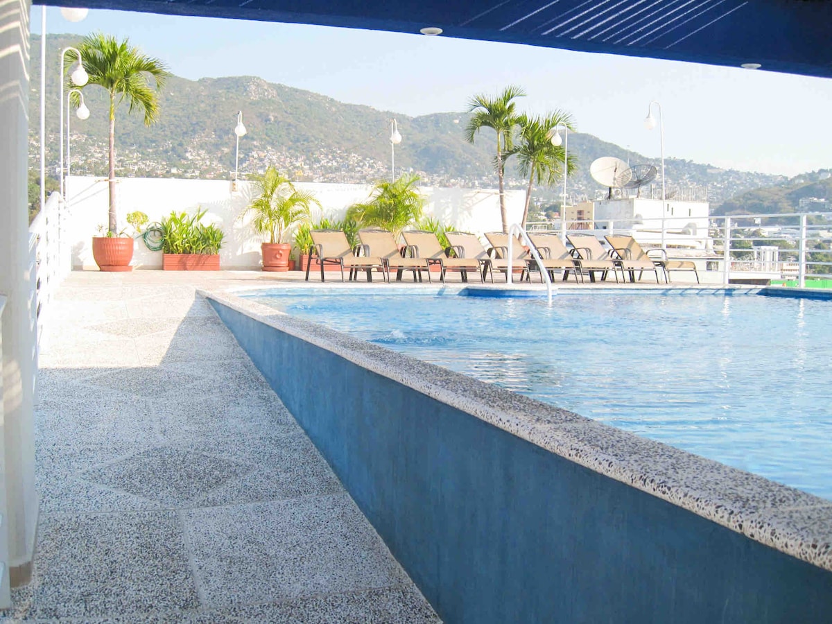Departamento tipo estudio bien equipado; muy cómodo con 2 camas matrimoniales y 1 sofá cama. Cuenta con Aire Acondicionado, wifi, Internet, tv por cable, Lavadora, Plancha, Cocina Equipada con microondas, Licuadora y Cafetera El edificio tiene Alberca, Jacuzzi, Área de juegos, Elevadores, Vigilancia 24 horas, Estacionamiento gratuito. Rodeado de Centros Comerciales, Restaurantes, Bares. Zona segura y Tranquila, Atraviesa la calle y disfruta la mejor playa de Acapulco y una vista espectacular.