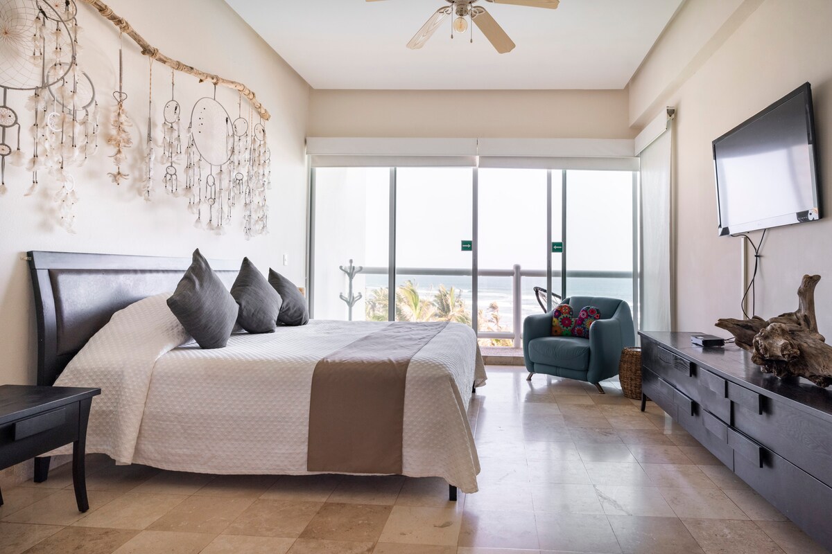 Apartamento con playa privada y con una hermosa vista al mar, con albercas y chapoteadero. El departamento esta bien iluminado, con ventiladores y aire acondicionado en las recamaras y áreas comunes, wifi, ventanales con salida hacia el balcón para siempre tener la hermosa vista de la playa y a su vez que el departamento este bien iluminado con luz natural durante el día, cocina y comedor totalmente equipados, sala con televisión, dos terrazas con sillas y mesas para reposar viendo el paisaje.