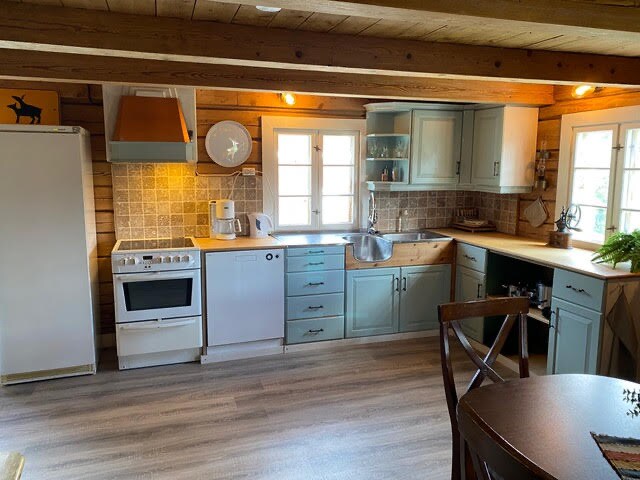 Apartamento único y recientemente renovado en granero con un lugar para fiestas que consta de una gran cocina, además de una mesa y sillas con capacidad para 16 personas. El departamento contiene dos dormitorios, un baño, un pasillo y una gran sala de estar con cocina (65 m2). La mayor parte del piso está azulejado con cables de calefacción y todos los electrodomésticos son modernos. Puedes lavarte el apartamento tú mismo o pedir una lavandería. La lavandería cuesta 1000 NOK al hacer el pedido. La ropa de cama cuesta 75 kr por pieza para alquilar, sin sacos de dormir.