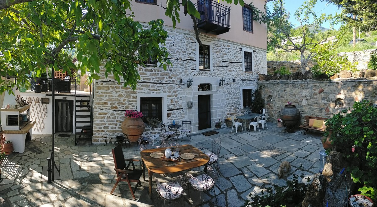 Una casa tradicional de piedra en el centro del pueblo de San Jorge en el monte Pelión, que tiene al mismo tiempo la privacidad perfecta. Una pequeña casa-estudio, junto a un arroyo de montaña, ideal para una estancia fresca durante el caluroso verano griego. Vegetación exuberante, gran patio con unas vistas estupendas al pueblo y al mar. - No hay wifi (todavía). ¡Disfruta de la naturaleza!
