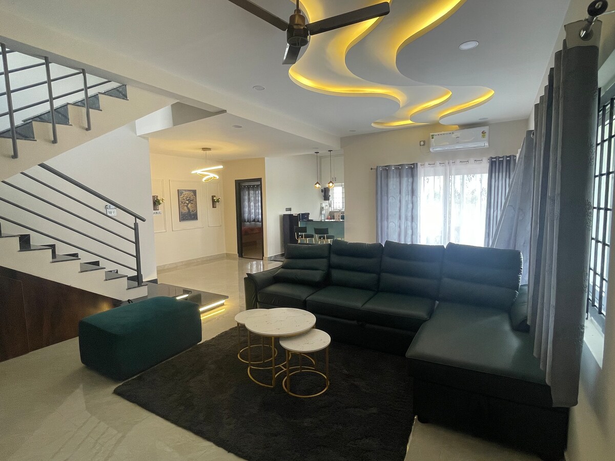 ¡Escápate a este refugio de alta tecnología de 2BHK a solo 1 hora de Bangalore! Perfecto para viajes de trabajo, fiestas o estadías románticas. Aspectos destacados: 🏊 Piscina privada: piscina de 20x12 pies + césped de 300 pies cuadrados. 🎬 Noches de cine: proyector en patio + Smart TV. 🔒 Privacidad total: puerta automática y paredes extendidas. 💻 Preparado para trabajar: wifi de alta velocidad y purificador de aire. 🍳 Cocina completa: barbacoa, nevera, microondas y agua RO. Entrega de comida a través de Swiggy/Zomato. ¡Se admiten mascotas! 🐾 Horario de silencio: de 10:00 p. m. a 6:00 a. m.