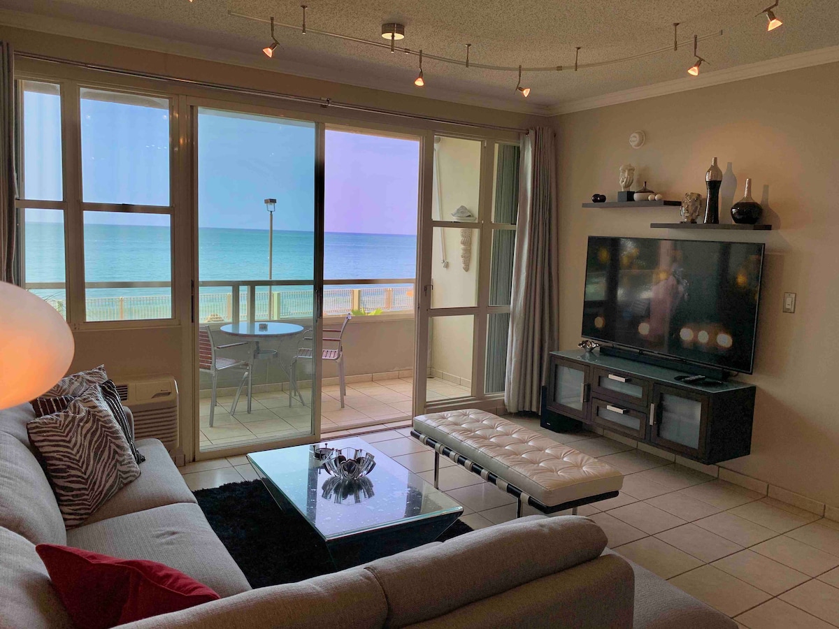 ¡Vistas espectaculares desde este increíble paraíso frente a la playa! Con el océano como patio trasero, ¿qué más se puede pedir? Siéntate y relájate en el balcón privado y deja que las olas que rompen eliminen tus preocupaciones y estrés, ¡contempla las puestas de sol más bellas de todo Puerto Rico! La piscina y la playa están a solo unos metros de distancia. Este lugar es justo lo que necesitas para olvidarte del mundo durante unos días. Aparcamiento privado seguro, acceso al ascensor y todo a 5 minutos en coche de las tiendas del centro de la ciudad, comida y eventos culturales.