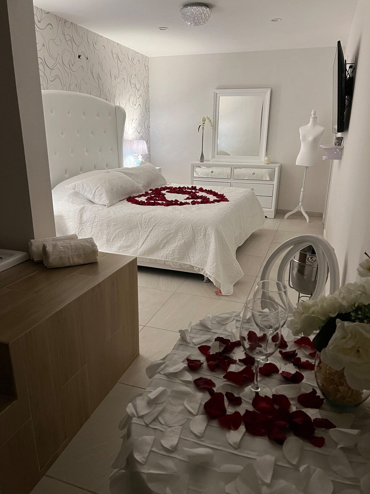 No querrás irte de este lugar tan único y encantador. Hermosa habitación super romántica, estilo francés contemporáneo, cuenta con jacuzzi para 2 personas, colchón king size memory confort, además con un pequeño desayunador donde podrás compartir con tu acompañante de las amenidades que tenemos para ti (costo extra) podemos ofrecer también transporte con costro extra a cualquier punto de la ciudad o bien crear un recorrido turístico.