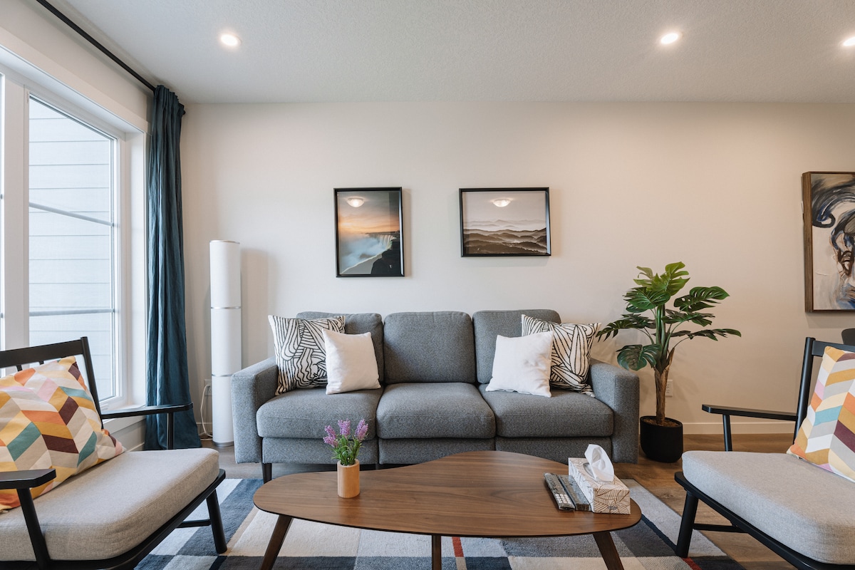 Moderna suite de 2 dormitorios en el sótano legal ubicada en el cuadrante suroeste de la ciudad. Adecuado para una persona, pareja o familia que viaje a Banff, Lake Louise, Jasper, visite Calgary o simplemente busque un lugar acogedor para relajarse. - A 10 minutos de Calaway Park. - A 10 minutos del Parque Olímpico de Canadá. - A 1 hora de Banff. - A 7 minutos a pie de la parada de autobús. - A 2 minutos a pie del parque infantil. - A 15 minutos en coche de restaurantes y tiendas, centros comerciales y parques. - Tienda de comestibles, clínica dental, farmacia, licores, pizzería en el barrio.