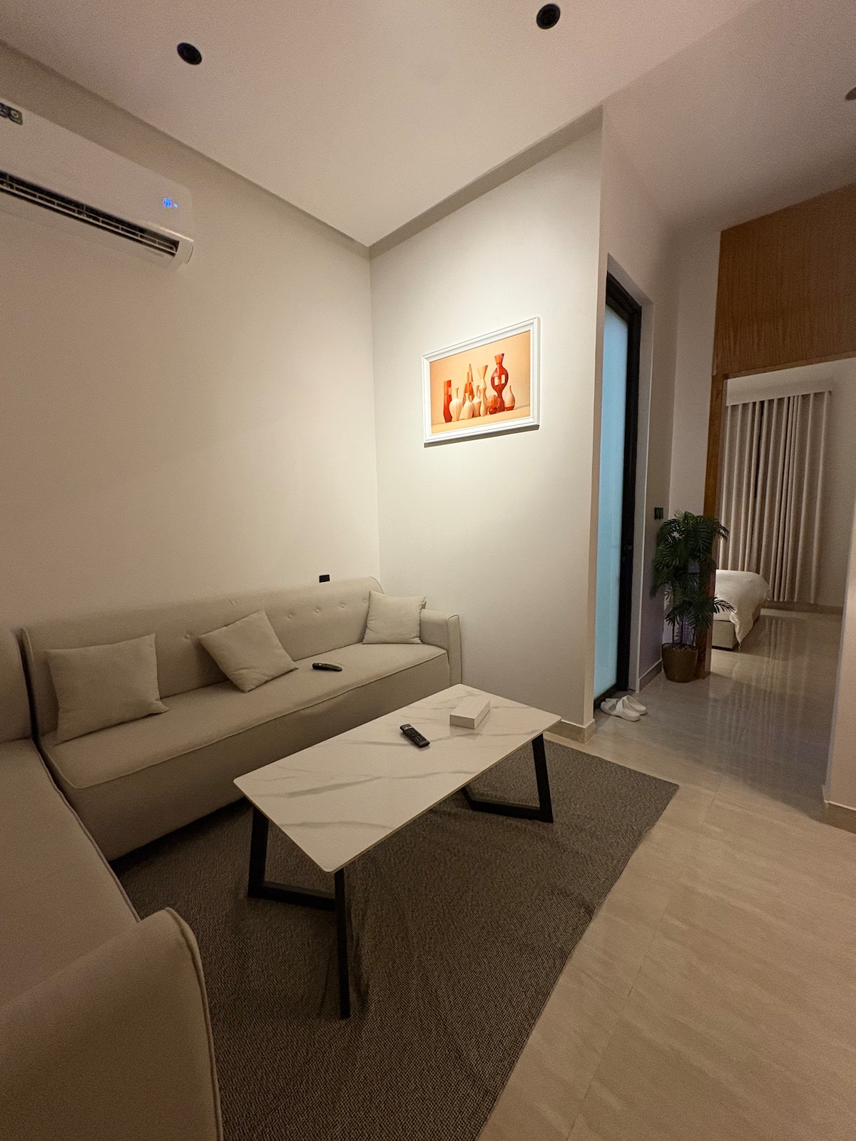Welcome to our stylish studio apartment in Khobar. This modern space is perfect for solo travelers or couples seeking comfort and entertainment. The studio features a comfortable bed and sofa, a well-equipped coffee corner, a cabinet. Enjoy your favorite shows on the 60" Smart TV, complete with complimentary Netflix access. Whether you're catching up on your favorite series or enjoying a movie night, the entertainment is at your fingertips High speed fiber internet has been installed!