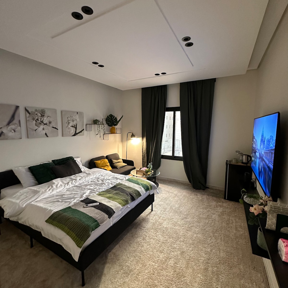 Gran estudio con diseño elegante y toques de lujo Tiene una cama cómoda, TV inteligente, internet rápido y un jacuzzi privado Un baño con acabado de hotel, situado en el barrio de Olaya Al Khabar, cerca de cafés, restaurantes y servicios. Entra por tu cuenta para una experiencia tranquila y acogedora.
