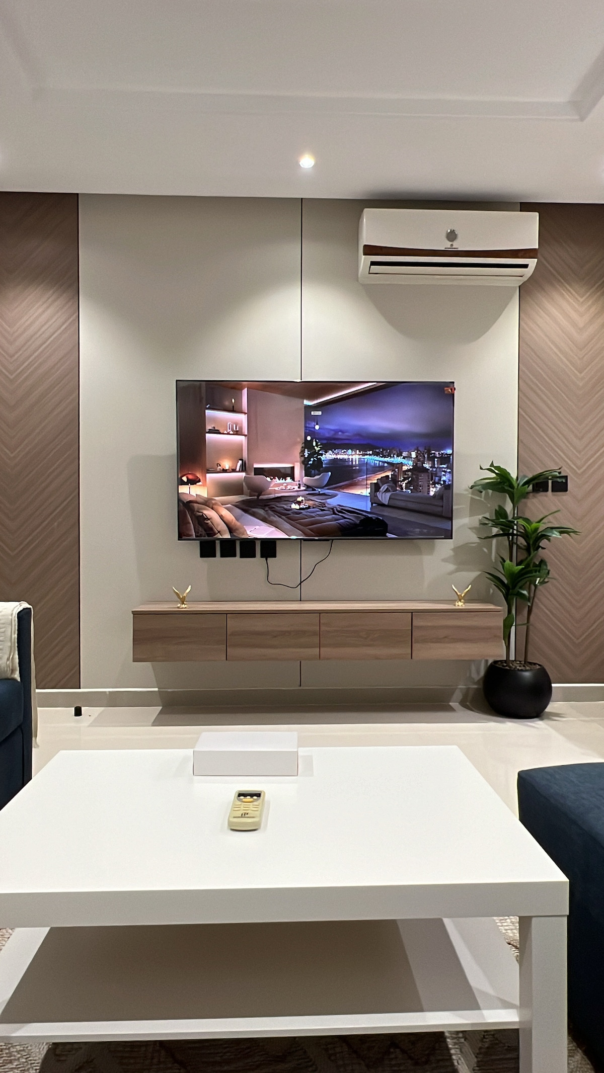 Moderno departamento en Al Muruj, diseñado con un toque moderno y elegante que combina el lujo del hotel y la comodidad del hogar. Cuenta con un cine privado con sillones reclinables, sonido 3D, proyector inteligente, máquina de palomitas de maíz y máquina de hielo. Incluye dos elegantes dormitorios, una amplia sala de estar con TV QLED de 85 pulgadas y Netflix, YouTube, Disney+, Shahid y OSN activos. Cocina totalmente equipada, wifi de alta velocidad, llegada autónoma segura y ubicación privilegiada y tranquila cerca de Riyadh Boulevard y KAFD.
