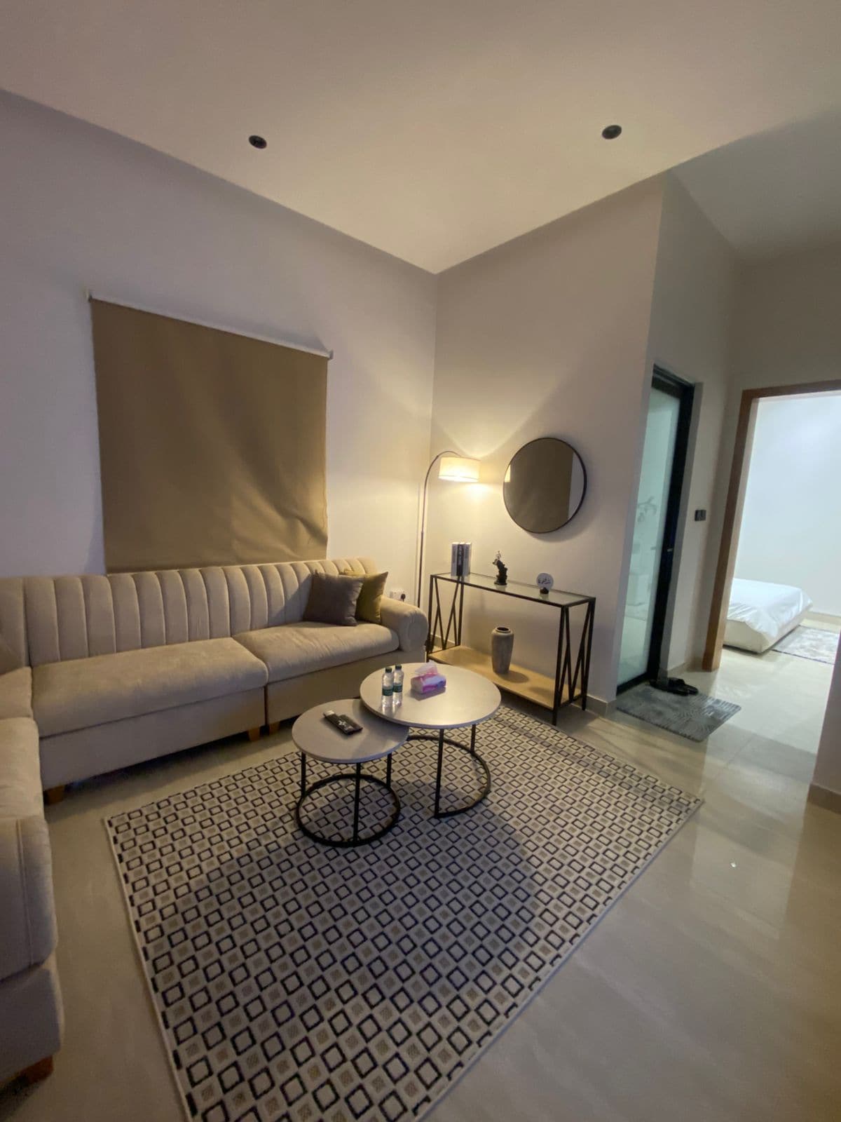 - Cómodo dormitorio: incluye una cómoda cama con sábanas suaves y un diseño cómodo que garantiza noches de sueño tranquilo. Con un televisor inteligente, puedes ver canales de televisión a través de Shahid VIP y vídeos en YouTube y Netflix. - Cocina equipada: contiene todas las instalaciones necesarias, incluyendo nevera y hervidor. - Baño limpio: el baño está equipado con todos los suministros necesarios. - Comodidades adicionales: las comodidades adicionales incluyen una plancha y un aislante acústico eficaz. - Acceso autónomo: las unidades están aseguradas con la función de acceso autónomo - Servicio de Internet: servicio de Internet rápido y seguro.