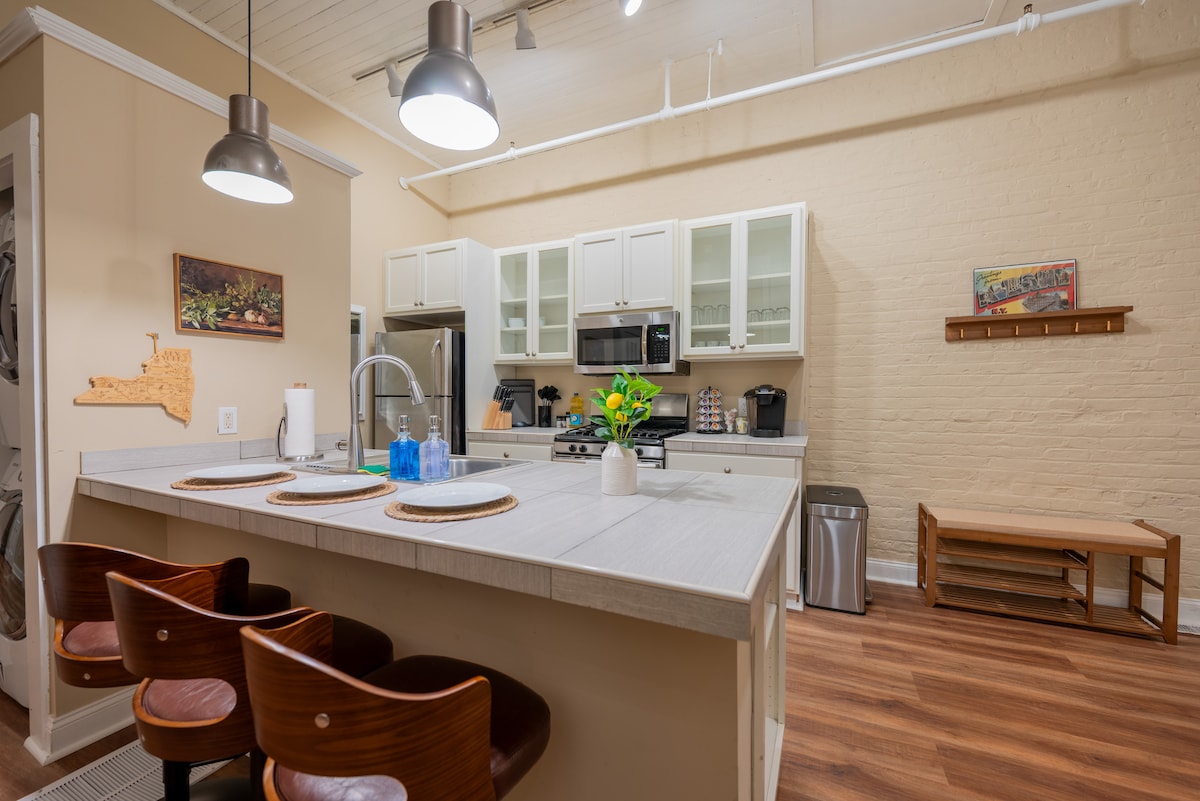 Bienvenido a la Mansion Suite, una joya histórica recién reformada en el corazón de Center Square. A través de una entrada privada, por un largo vestíbulo, descubrirás la gran Oak Room, un amplio salón comedor con una espectacular chimenea, paneles, techos con vigas y vidrieras. Junto al salón hay una cocina elegante y totalmente equipada con electrodomésticos nuevos de acero inoxidable. Ambos dormitorios tienen camas tamaño queen nuevas, hermosas maderas naturales y dan a un patio privado y tranquilo.