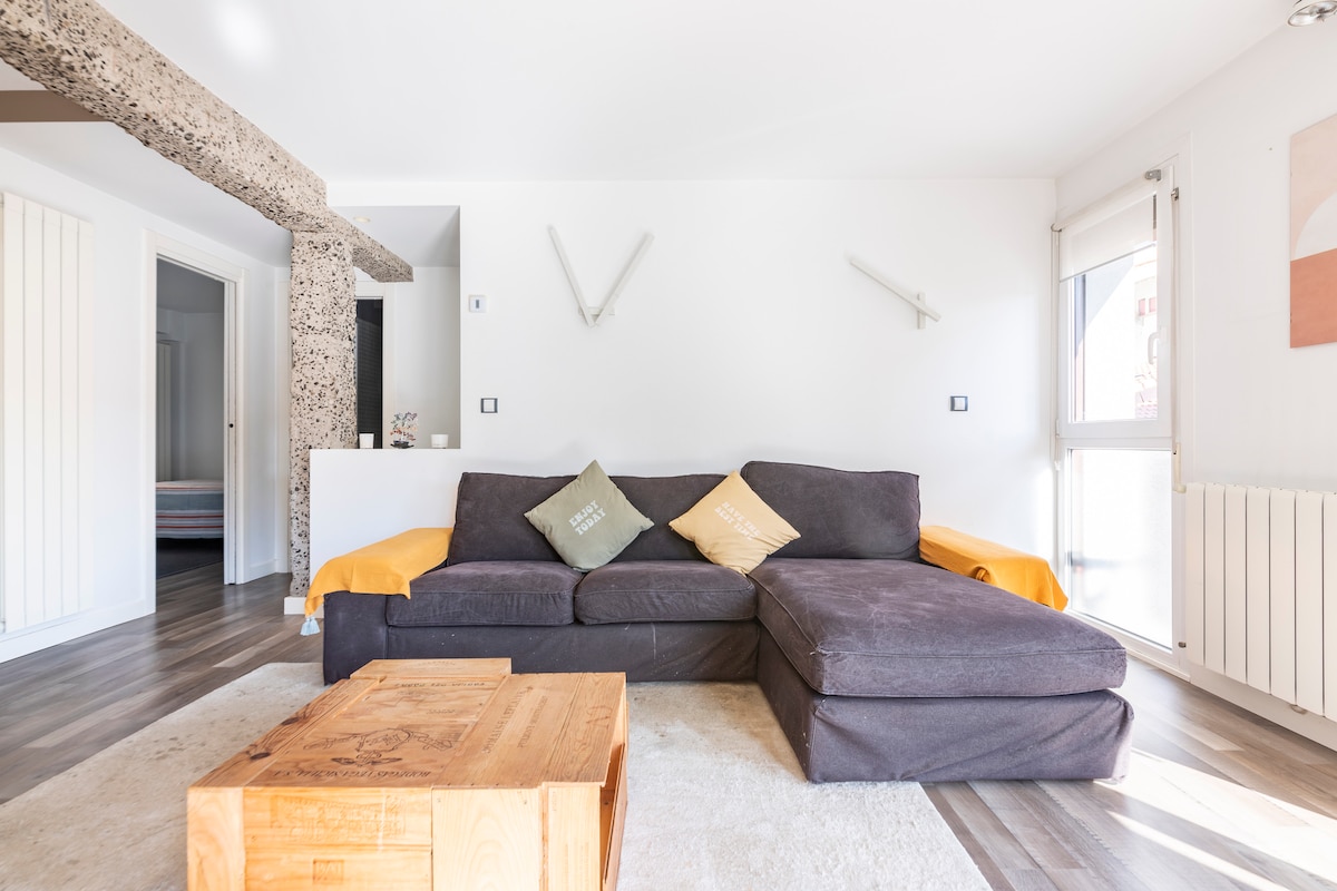 De estilo urbano y acogedor, este nuevo apartamento de un dormitorio con cama kingsize y sofá cama (144x180cm)se encuentra en el corazón del barrio de Gros, a 1 minuto a pie del centro de la ciudad Impecablemente recién reformado cuenta con aire acondicionado, televisión 55", Wifi, Nesspreso. Completamente equipado para niños y bebés. Perfectamente ubicado a 2 minutos de la estación de autobuses y de trenes, así como al lado de una parada directa de autobús para el aeropuerto de San Sebastián.