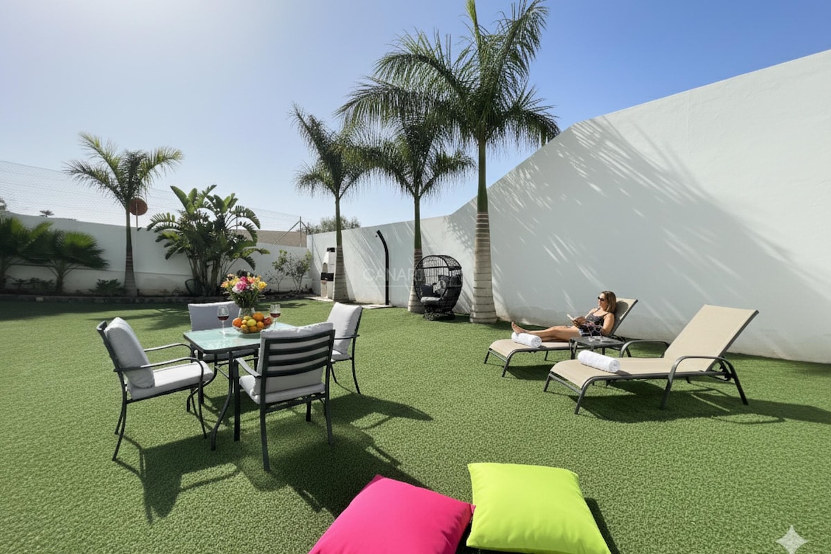Bienvenido a nuestra acogedora casita frente al mar en Oasis del Sur! Con vistas a las tranquilas aguas de Golf del Sur, nuestra casa adosada ofrece una escapada tranquila para familias, parejas o amigos que buscan tranquilidad. Relájate y disfruta de un espacio funcional y bien decorado, con dos dormitorios dobles, dos cuartos de ducha y una terraza soleada perfecta para tomar el sol o comer entre amigos. Date un chapuzón en la tranquila piscina climatizada de agua salada.