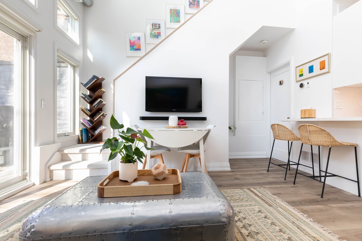 This incredibly stylish 1BR condo has it all: a spacious, open-concept suite with large windows and loads of natural light. It's beautifully designed with new hardwood floors throughout; inviting living area with pullout sofa to sleep extra guests, armchair and large flat screen TV; dining area comfortably seats 4 guests; kitchen with island; separate bedroom with comfortable queen size bed; full bathroom with shower/tub; washer and dryer in the unit. High-speed Internet, free parking included!