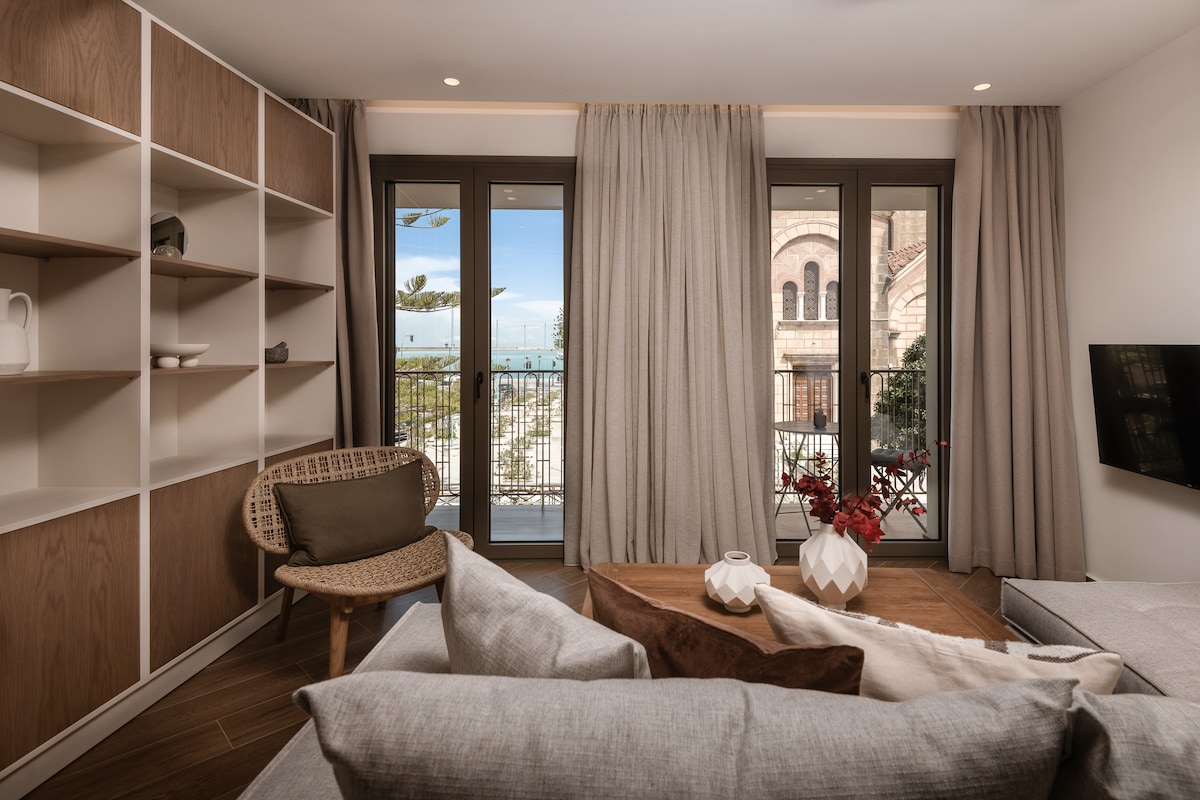 El Estudio Doble Deluxe en la planta baja es una habitación de planta abierta de 30 metros cuadrados con una cama doble y una pequeña cocina (nevera pequeña, horno, hervidor de agua, tostadora, cafetera y utensilios de cocina). Los fogones se encuentran en la terraza y se proporcionan artículos de despensa (sal, pimienta y aceite de oliva). Incluye aire acondicionado, baño con ducha, secador de pelo, TV y wifi. La terraza amueblada ofrece unas vistas impresionantes al mar. Tiene capacidad para 2 personas y ofrece una cuna gratuita para niños de hasta 2 años, previa solicitud.