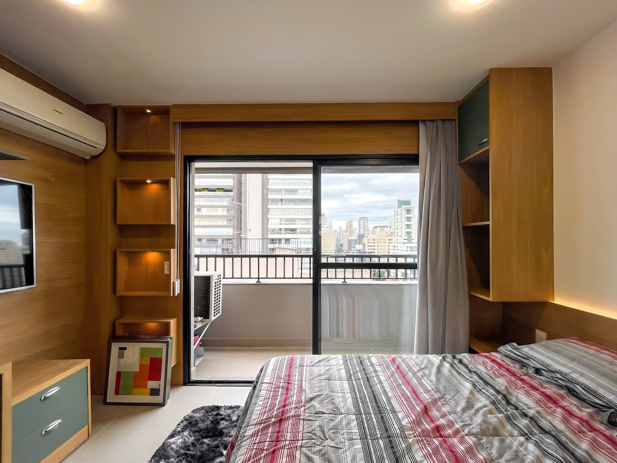 ATENÇÃO: Para utilizar o facility do estacionamento deve-se avisar com antecedência. Consulte a entrada do local nas fotos. Loft moderno bem decorado com vista urbana linda de São Paulo. Oferece cama Queen com pillowtop de 10 cm, TV de 50 polegadas, e ambiente iluminado pelo sol. A cozinha é equipada com utensílios de qualidade e inclui mesa de jantar e bancada de trabalho. O armário tem um bom espaço de armazenamento e o apartamento conta com ar-condicionado para conforto o ano todo.