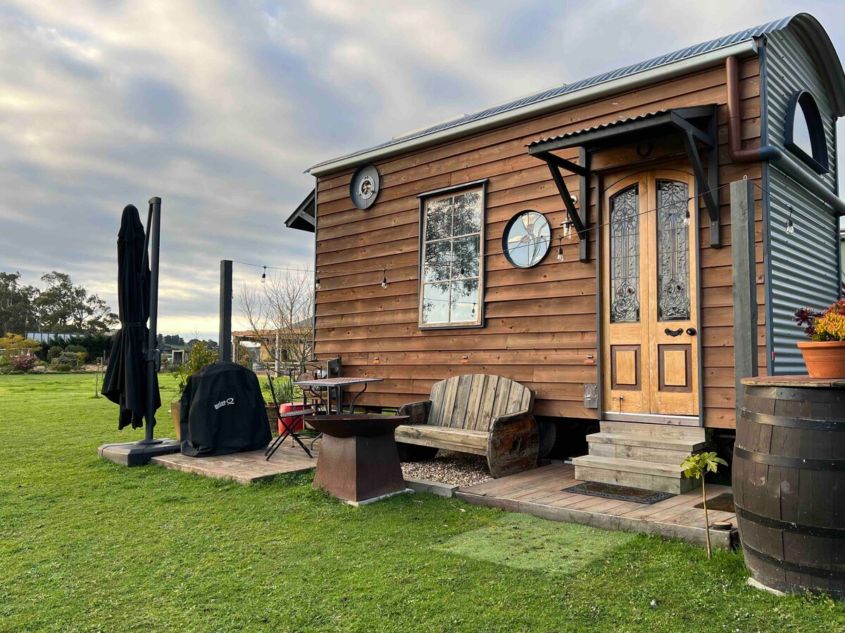 The Cedar: uno fuera de diseño arquitectónico, hecho a mano, ecológico, solar 'Tiny House on Wheels' ubicado en un semental de caballos y ganado en Nyora South Gippsland. Ubicado cerca del encantador pueblo de Loch o disfruta explorando las muchas atracciones que Gippsland tiene para ofrecer y luego vuelve a casa a tu propia escapada privada con vistas al impresionante jardín privado y a los prados. Accede al inicio del sendero ferroviario de South Gippsland. Acogedor y cálido privado, disfruta de las estrellas con una cálida fogata
