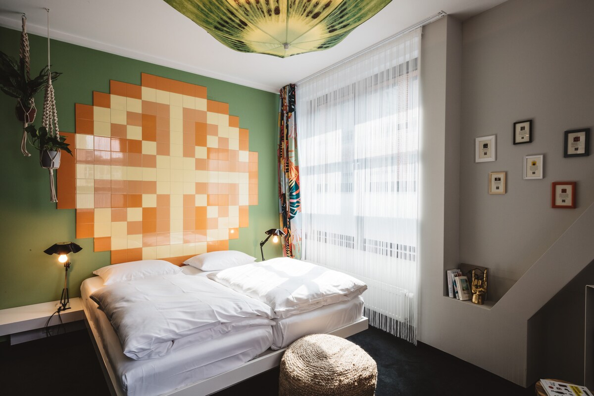 Nuestras habitaciones medianas pueden ser la categoría más pequeña, pero ¿adivina qué? ¡Son más espaciosos de lo que crees! Hay espacio más que suficiente para una o dos personas en alrededor de 20 m² con ventanales extra grandes para momentos soleados. Con su colorido aspecto, la habitación doble te llevará en un viaje al paraíso con muchas plantas para el aire fresco, una luz de flamenco brillante y extras tropicales para descubrir. ¡El diseño inspirado en el paraíso de la habitación te pondrá en el estado de ánimo adecuado para sentir el boogie y relajarte!