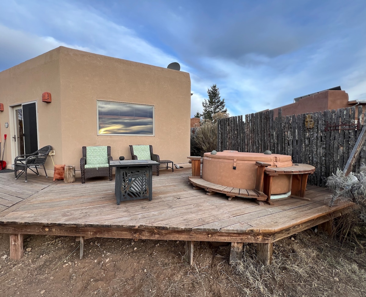 Dos Caminos Casita ofrece tranquilas vistas a la montaña en una tradicional casita de adobe construida hace más de 100 años con comodidades actualizadas, luz natural, vigas en el techo y hermosos azulejos. Si buscas comodidad, relajación y hermosas vistas, lo has encontrado aquí en Dos Caminos Casita. Disfruta de un baño en nuestro jacuzzi de aguas termales minerales mientras los cielos de Taos pintan un lienzo de color púrpura, naranja, azul o rosa. Espacio perfecto para retirarse después de un día de senderismo, rafting o esquí.