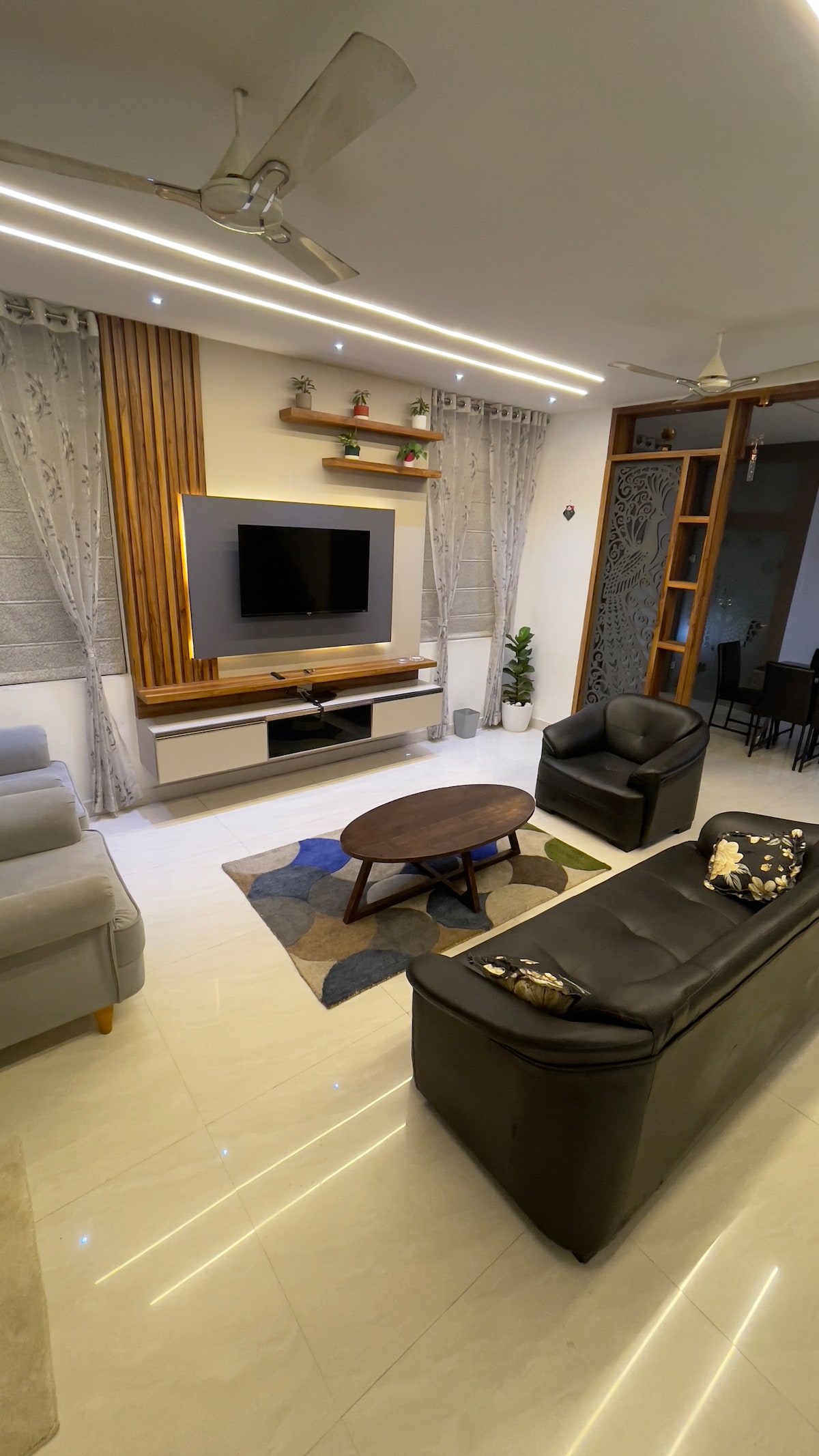 Servicios: Sala de estar con aire acondicionado y TV inteligente de 45 pulgadas Comedor con aire acondicionado 3 dormitorios con aire acondicionado y baños adjuntos Servicio de limpieza: una vez al día. Lavadora Cocina equipada Microondas, hervidor de agua, arrocera, purificador de agua Refrigerador 3 géiseres Estacionamiento para vehículos - 2 ** No se permiten fiestas estrictamente ** Solo se admiten familias o huéspedes corporativos