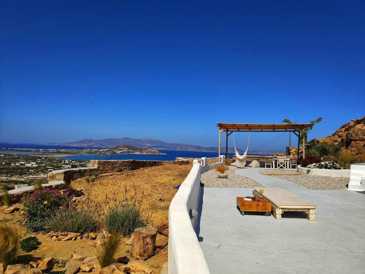 Moderna casa de diseño cicládico y cómoda con increíble luz y vistas espectaculares ubicada en un entorno privilegiado con un dormitorio y una gran terraza. La casa está a 2 km de la ciudad de Naxos en la colina, con vistas impresionantes a la bahía de Naxos. ¡Esta acogedora casa te ofrece todo para tus vacaciones! La casa está construida sobre una enorme roca y tienes jardín, una terraza muy grande con parrilla, pérgolas, sofás construidos y tu propia minipiscina. ¡Recomendado por Conde Nast Traveller!