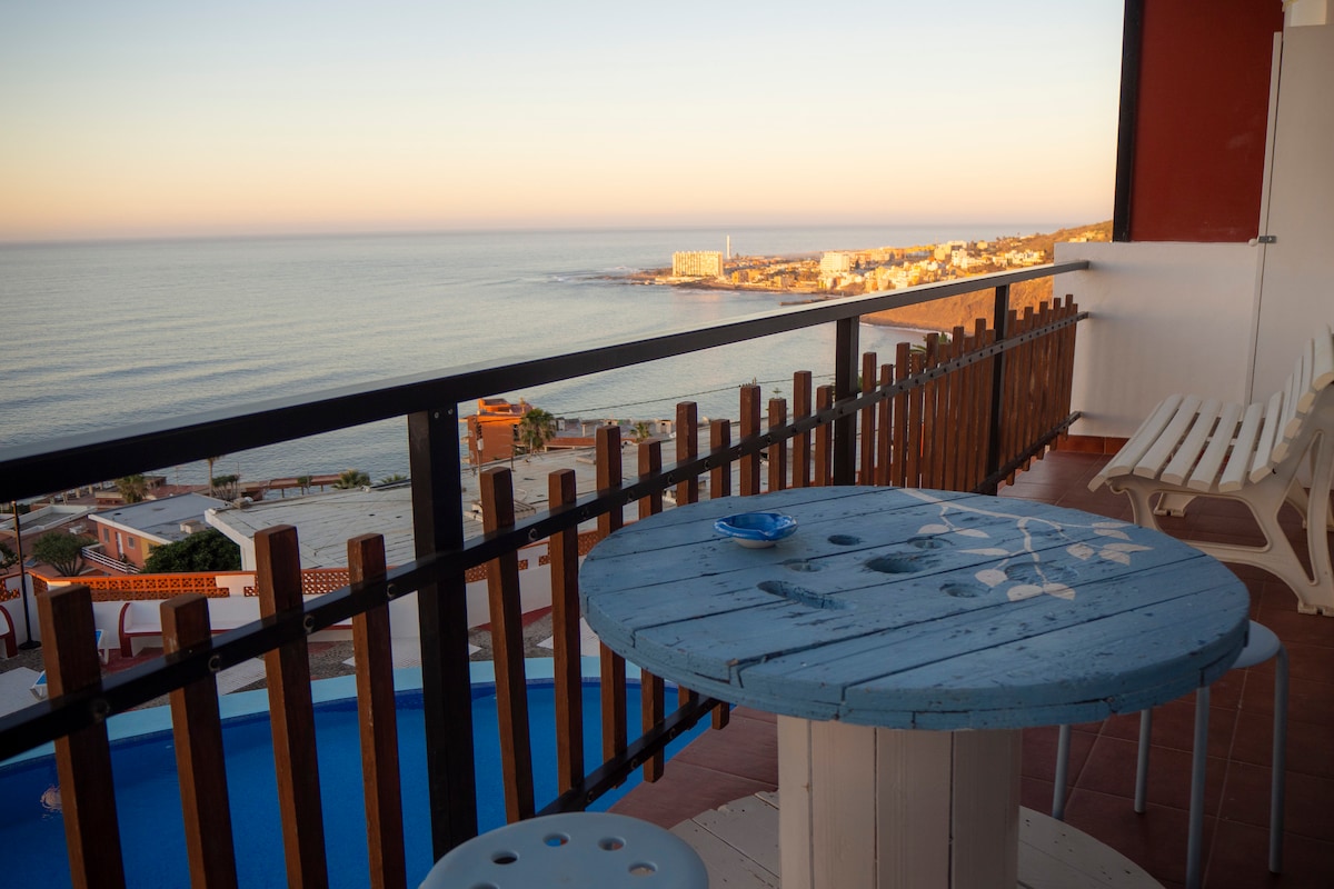 A diez minutos en coche desde Santa Cruz, encontrarás el encantador pueblo de Tabaiba, en el cual alquilamos un maravilloso apartamento con balcón con vistas al océano. La ubicación es ideal, puedes disfrutar ya sea de la coqueta terraza con vistas al mar, o acceder a la playa o la piscina natural que hay debajo usando el ascensor, directamente desde el edificio sin escaleras.