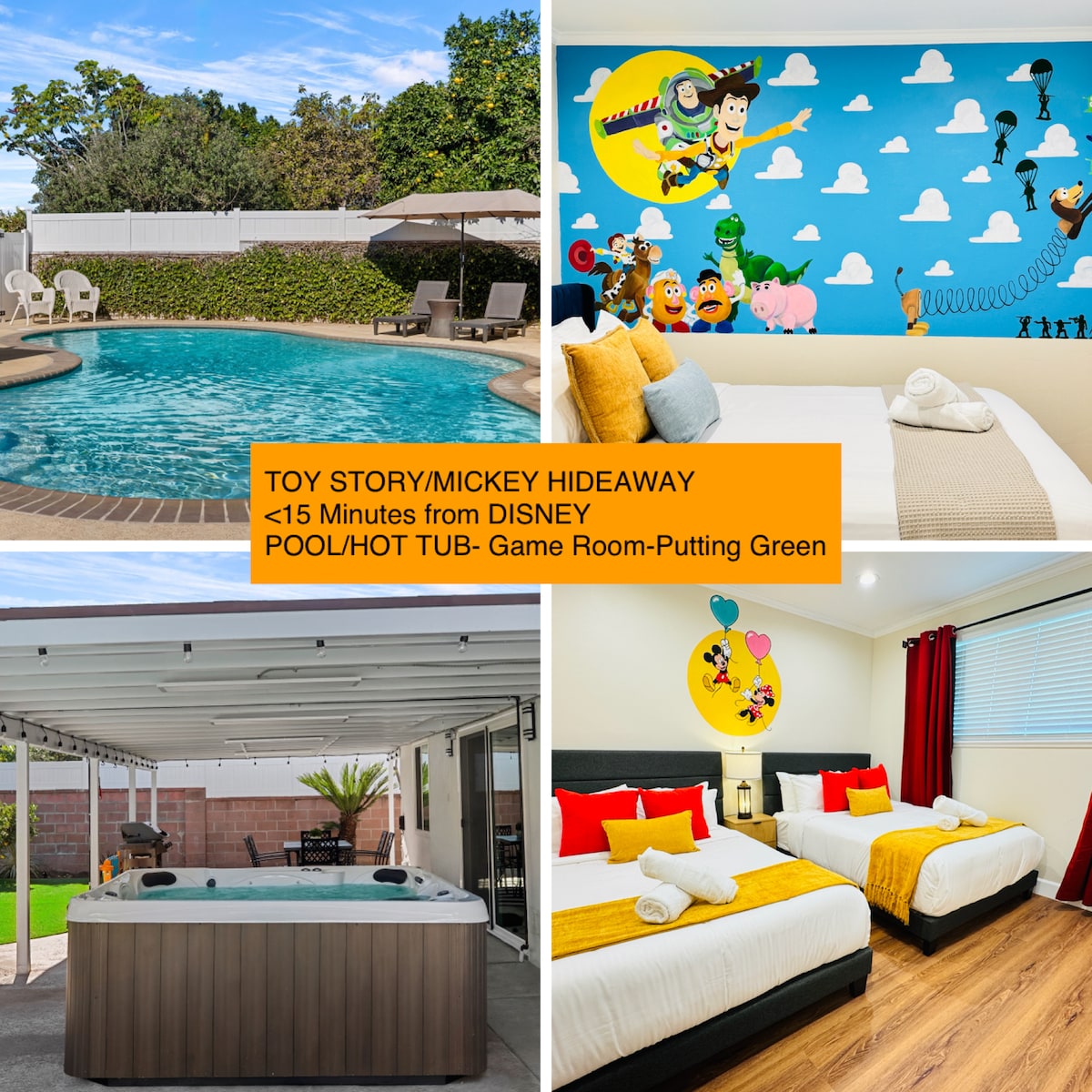 Esta villa nueva y elegante es perfecta para viajes familiares y en grupo a Disneylandia, centro de convenciones (a poca distancia a pie) a 1 milla de Disneylandia. Cuenta con 5 dormitorios, 2 son suites, 3 baños y un increíble patio trasero de 12000 pies cuadrados. Está equipada con 8 televisores de pantalla grande que incluyen un televisor de proyección de 100 pulgadas con sistemas de cine en casa para películas y programas deportivos. El patio trasero tiene un minigolf, chimenea, piscina climatizada, spa, 2 áreas de patio cubiertas separadas para disfrutar, relajarse y jugar a varios juegos al aire libre.