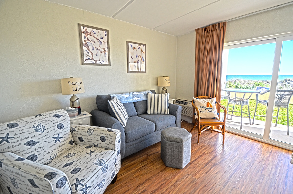 Relájate en este apartamento limpio y acogedor de un dormitorio y un baño con vistas directas a las hermosas dunas y playas de arena de Crescent Beach. Este condominio en el primer piso cuenta con un balcón privado frente al mar con vistas impresionantes al mar a solo un paso de la playa y la piscina. El condominio incluye wifi de alta velocidad, cocina completa abastecida con platos y utensilios de cocina, una cómoda cama king y mucho más. Este condominio es ideal para parejas que buscan una escapada relajante.