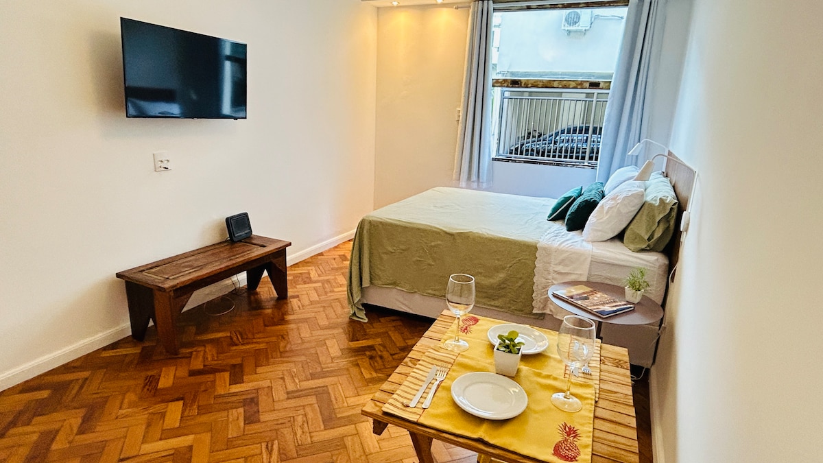 LO más destacable: - ¡Apartamento con vista lateral al mar y completo en la esquina de la playa de Copacabana! - Amplio comercio local: mercados y restaurantes y a 5 minutos del metro. - Cerradura electrónica - Wifi de alta velocidad. Recepción las 24 horas, los 7 días de - Aire acondicionado en todas las habitaciones. - Sala de estar con SmartTV y aire acondicionado. - Amueblado y equipado, con cocina completa. Nota: la televisión es solo inteligente, no tiene televisión ni cable. Accede al streaming disponible al iniciar sesión en tu cuenta personal. Antes de reservar, lee las reglas de la casa