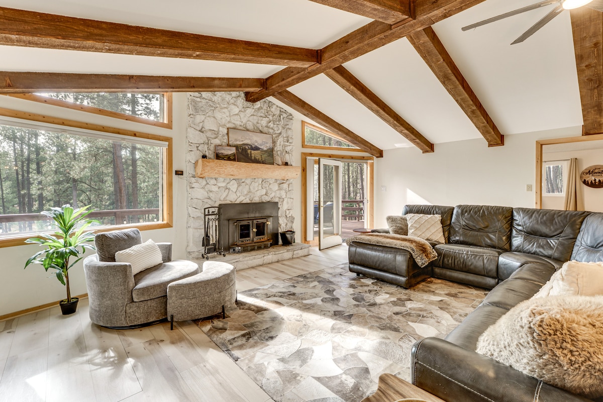 Disfruta de unas vacaciones relajantes en esta cabaña de una sola planta bien equipada. Hay 3 dormitorios en suite, cada uno equipado con su propio televisor Roku. Hay un aseo muy bonito junto a la sala de estar. La hermosa chimenea de piedra de doble cara es el punto focal de la sala de estar y la cocina. Se proporciona leña. Todos los pisos están climatizados, ¡incluido el garaje! Maravillosas vistas desde las cubiertas delantera y trasera. ¡Y no hay escalones en el interior de la casa! Tres camas tamaño king más un sofá cama tamaño queen para tu comodidad.
