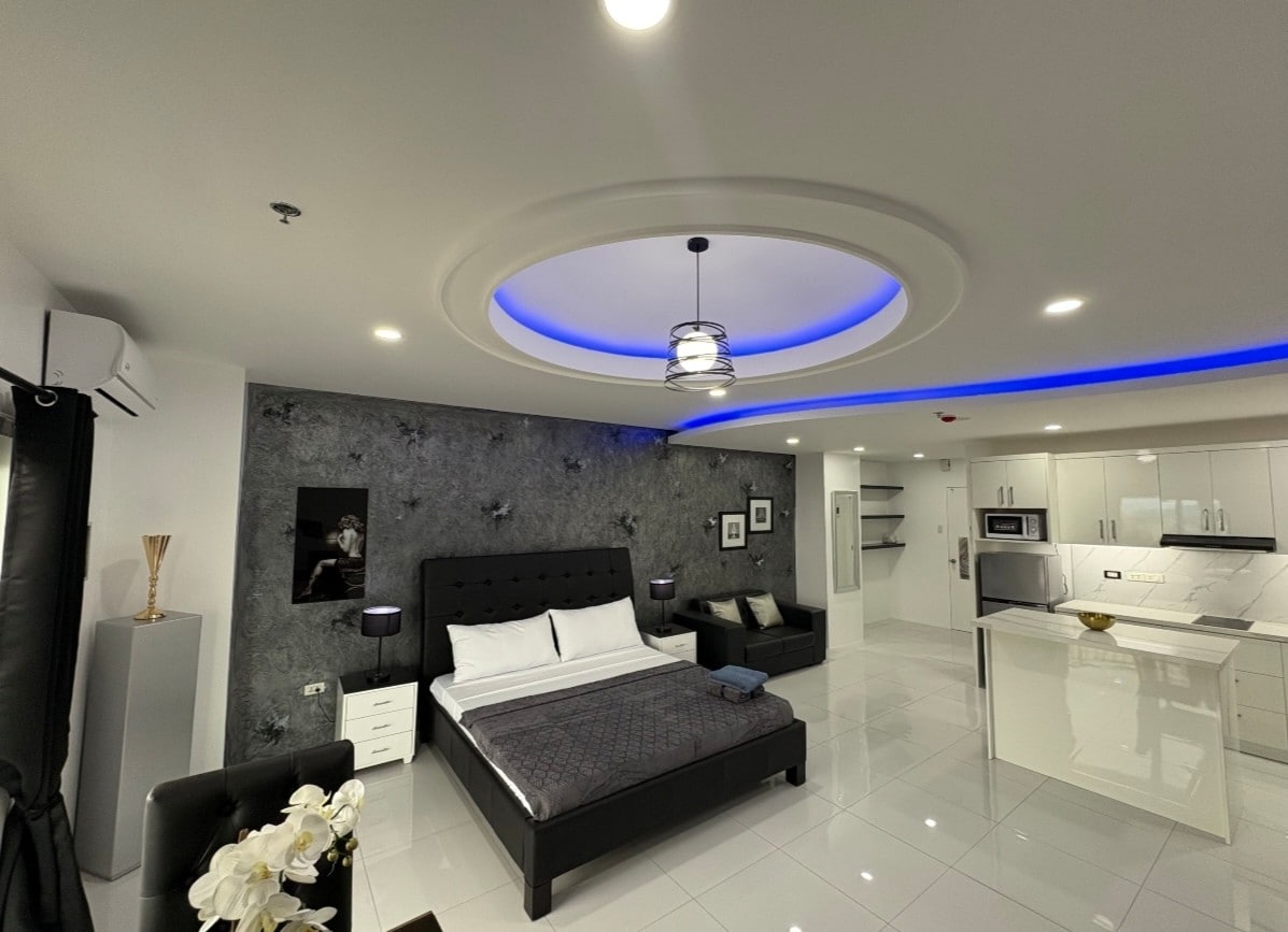 Estudio en el segundo piso con patio sobre la piscina, paquete de Internet ejecutivo, TV Samsung Smart 4K de 55 pulgadas, cocina totalmente equipada con utensilios de cocina, utensilios y cubiertos nuevos. Nueva cafetera de goteo, microondas. Una unidad para no fumadores con balcón con vistas a la zona de la piscina. La Grande Residence se ha convertido en la mejor opción tanto para viajeros de negocios como para turistas que visitan Clark Freeport y la zona de Pampanga. Relájate y desconecta en este alojamiento tranquilo, seguro y elegante.