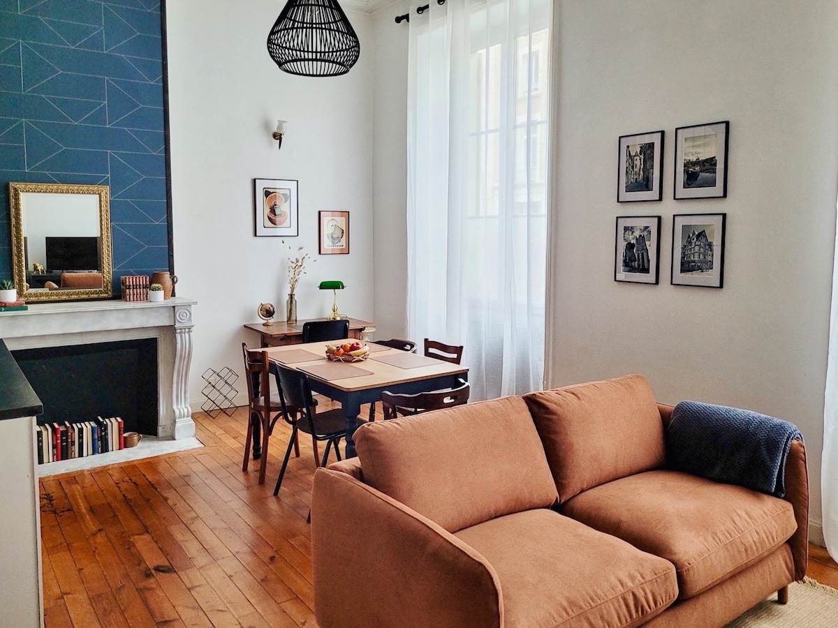 El apartamento de muy alto standing se encuentra escondido, en una antigua mansión, en el corazón del centro histórico de la ciudad de Angers, cerca de la plaza Imbach (antigua plaza de los Mercados) y de la iglesia de Nuestra Señora de las Victorias. El lugar fue diseñado como un lugar relajante, revitalizante y sutilmente inmersivo en el ambiente histórico de Angers. Dispone de todas las comodidades necesarias para pasar una agradable estancia: Ropa de cama de primera calidad, Wifi, TV, Netflix, Café…