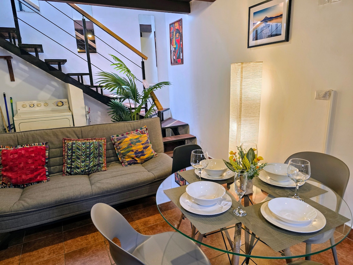 Apartamento de un dormitorio en el centro de La Antigua Guatemala. Sala con chimenea, comedor para 8 personas, cocina completamente equipada, un baño completo, patio con fuente, seguridad 24 horas y distancia 100% caminable al Parque Central de 5 cuadras y áreas comerciales. Tenemos Mini Bar, puedes pagar por medio de Airbnb o Cash.