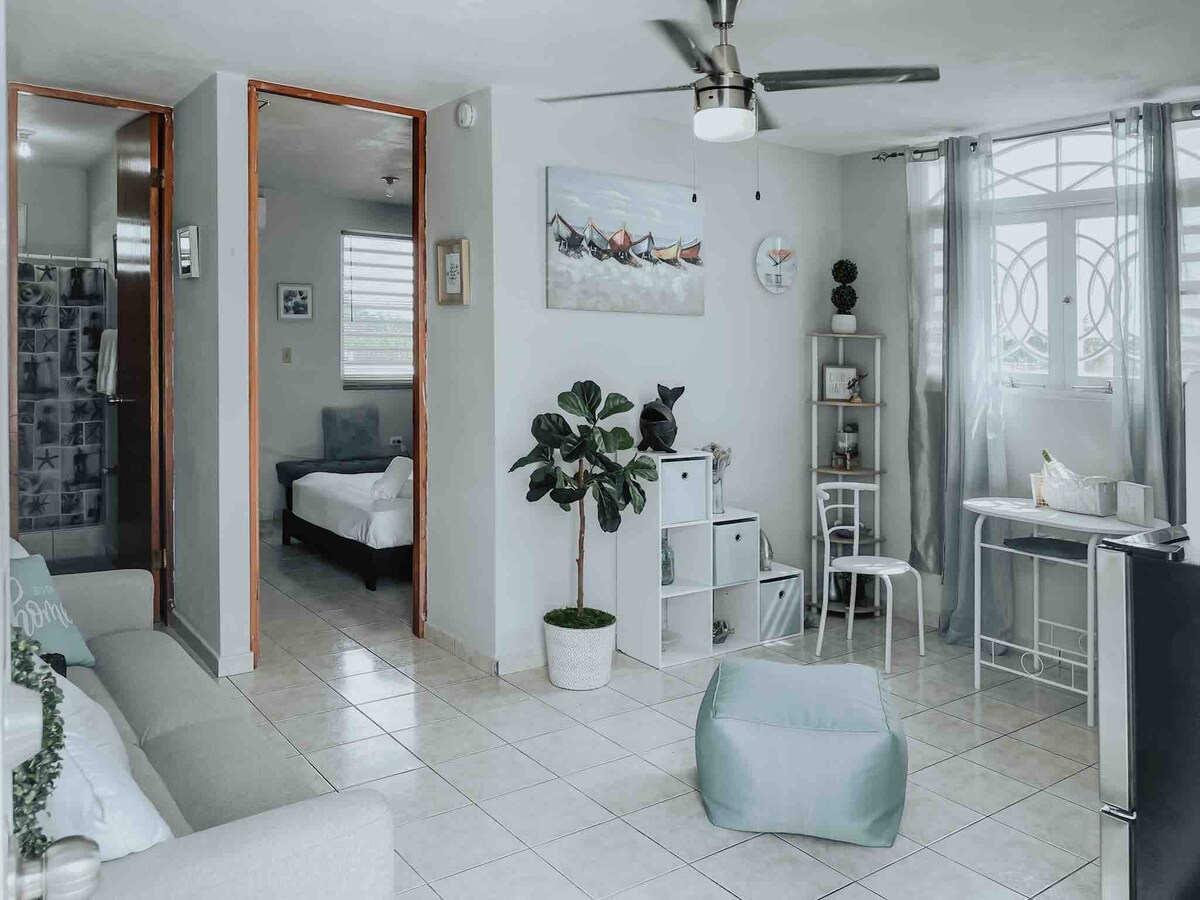 Comfy 2nd floor apartment in the Metropolitan Area of Rio Piedras, San Juan. Just minutes away from Airport, Coliseo, Distrito T-Mobile, Old San Juan, great beaches and more. Best way to get around is by Uber or rental. Super clean, private, fully furnished and all the essentials. One hotel like bedroom with comfy Queen bed, inverter AC and closet. Equipped kitchen with electric stove, microwave, small refrigerator and coffee maker. It has a shared entrance (stairs) and roof terrace.