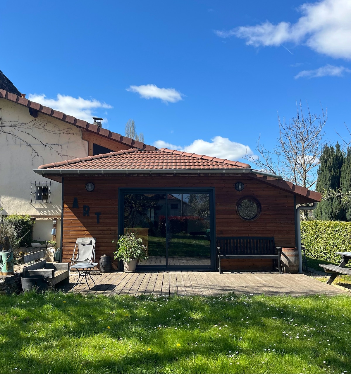 Casa rural independiente, contigua a nuestra casa en un gran jardín arbolado. Entorno tranquilo campo lagos y montañas. ideal para 4 personas . 9 camas posibles. Totalmente climatizado Gran sala de estar, cocina equipada/zona de estar con 2 sofás (1 convertible 160/2 pers.)+ gran mesa de 10 personas/1 dormitorio con 2 camas individuales + 1 cama supletoria/altillo con colchón en el suelo (1x2 +2x1 = 4 personas)/SDB con ducha italiana/1 inodoro/terraza exterior privada. acceso A43 en 3'. Sin TV ni fiestas para no fumadores