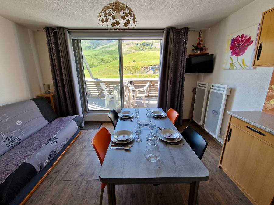 Apartamento soleado, vistas y acceso a las pistas desde el alojamiento. El apartamento es funcional, está muy bien equipado (microondas, lavavajillas, placa eléctrica, horno, aparato de raclette, cuna, secador de pelo , consola de videojuegos) No tendrá que coger el coche durante la estancia, hay un centro comercial en el centro de la estación. Muy bonita zona de esquí y punto de partida de excursiones. En la frontera de España a menos de una hora en coche.