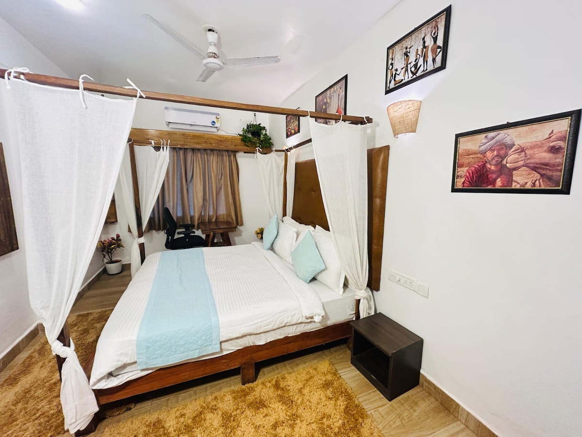 Habitaciones Deluxe en la playa de Arambol con piscina | Encanto rústico de Goa Experimenta la mezcla de la tradición de Goa y la comodidad moderna a solo unos pasos de la playa de Arambol, en el norte de Goa. Cada habitación Deluxe cuenta con interiores de madera rústica, una cómoda cama tamaño queen, baño privado, aire acondicionado y wifi. Disfruta de una piscina compartida en medio de palmeras, una terraza tranquila y una vegetación exuberante. A solo 2 minutos de la playa, cerca de Sweet Water Lake, lugares de yoga y cafés: la escapada tropical perfecta para la relajación y la serenidad.