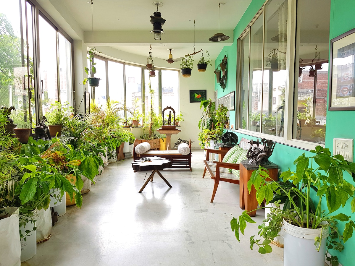 Relax in this calm, stylish private studio apartment with an English garden setting at the end of a quiet lane. This is one of Jaipur's most unique properties. Well-lit, open floor plan featuring en-suite bath, kitchen, dining, and living room. It's the perfect artist's or writer's retreat after a day out and about in Jaipur. Easy access to main roads, public transportation, restaurants, and parks yet a world away from the bustle of the Pink City