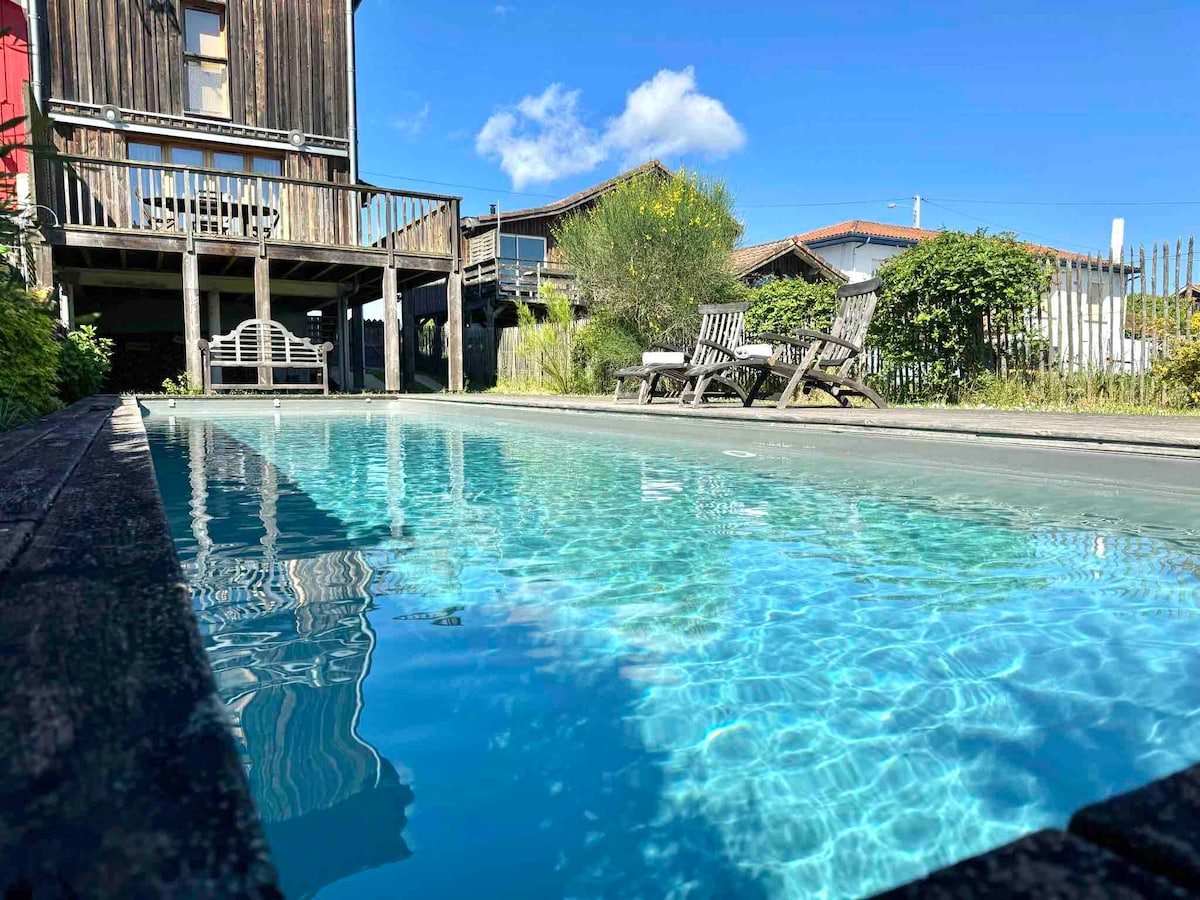 Casa entera 6 viajeros 3 dormitorios - 5 camas - 2 baños - piscina privada - varias terrazas - estacionamiento (cargador eléctrico). “Cabaña” en el puerto de La Teste. A 10 minutos de las playas y la duna de Pilat. Auténtico distrito de cultivo de ostras. Estación de tren a 400 metros de distancia. Atípico para la comodidad proporcionada por la madera, sus terrazas, su entorno acuático (entre el puerto y el 'canelot'), sus vistas, su piscina y las ostras del vecino, las mejores de la cuenca. Esta es mi casa personal.