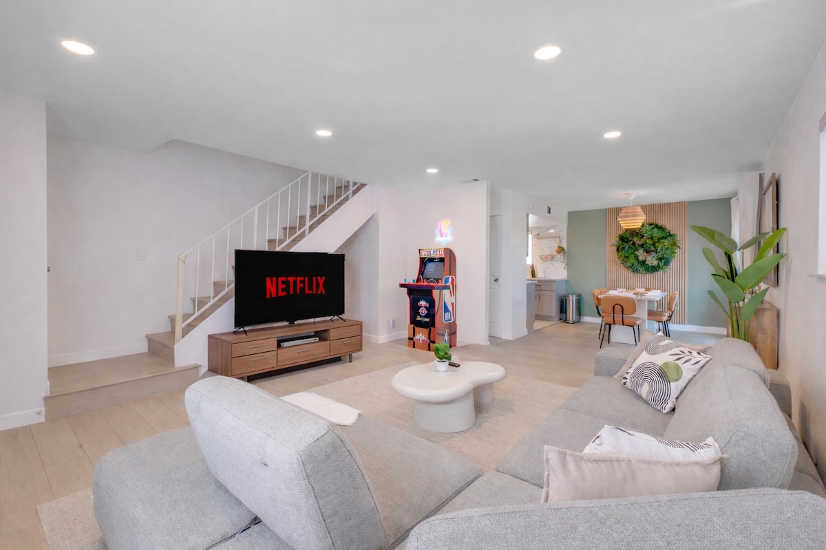 Moderna casa inteligente de 3 dormitorios y 3,5 baños en el condado de Orange: cada dormitorio está diseñado lujosamente con baño privado en suite con inodoros inteligentes + armarios iluminados y ropa de cama cómoda. A solo 30 minutos de Disneyland y las playas de OC. Diseño abierto con cocina elegante, comedor para 6, bar para 3 y sala de estar elegante. Aire acondicionado dividido en todas las habitaciones, Wi-Fi rápido y garaje para 2 autos. A minutos de Disneyland, playas, DTLA, Crypto Arena, SoFi Stadium y más. Capacidad para 8 personas. Limpieza profesional, perfecto para familias, grupos.