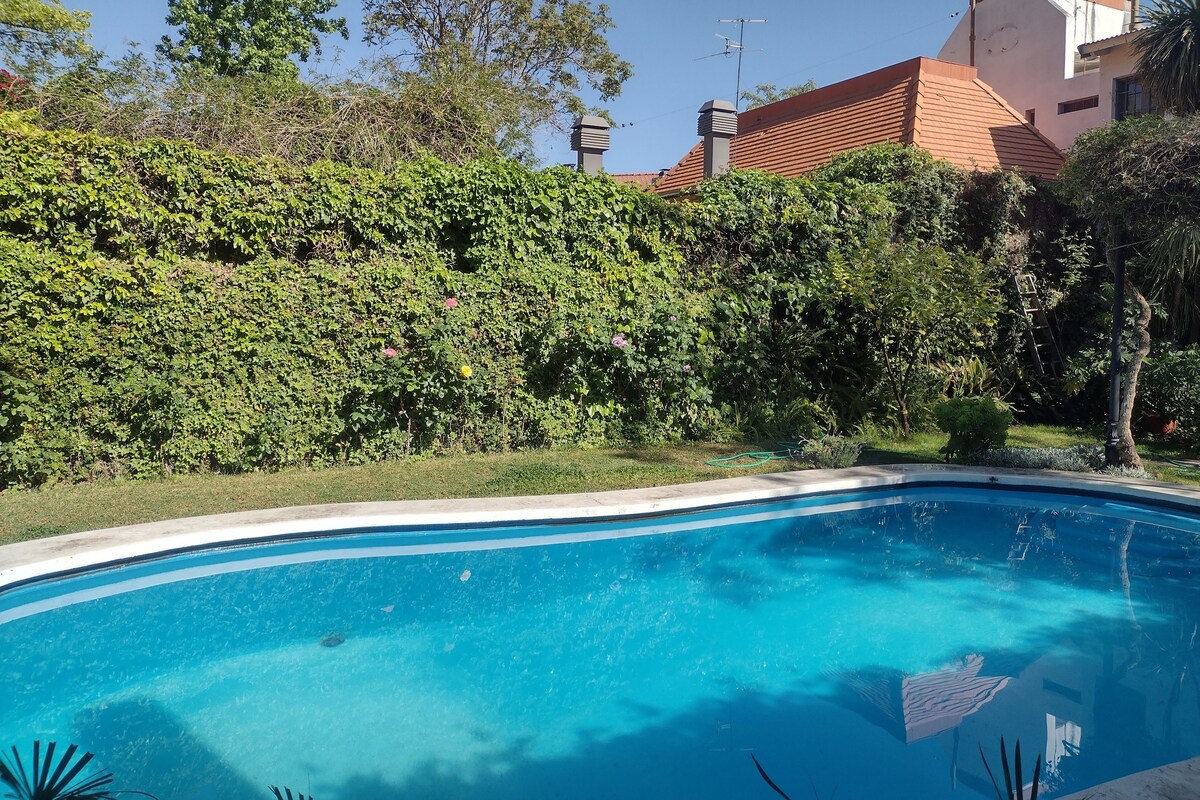 Hermosa habitación con baño en suite en el corazón de la Quinta Sección, con aire acondicionado, frío-calor, ingreso independiente y rodeada de un frondoso parque y una gran pileta de 8x4 mts. Ubicado a dos cuadras del Parque Gral San Martín y media de Av. Arístides Villanueva, donde se encuentran los mejores restaurantes, cafés y bares de la ciudad de Mendoza.