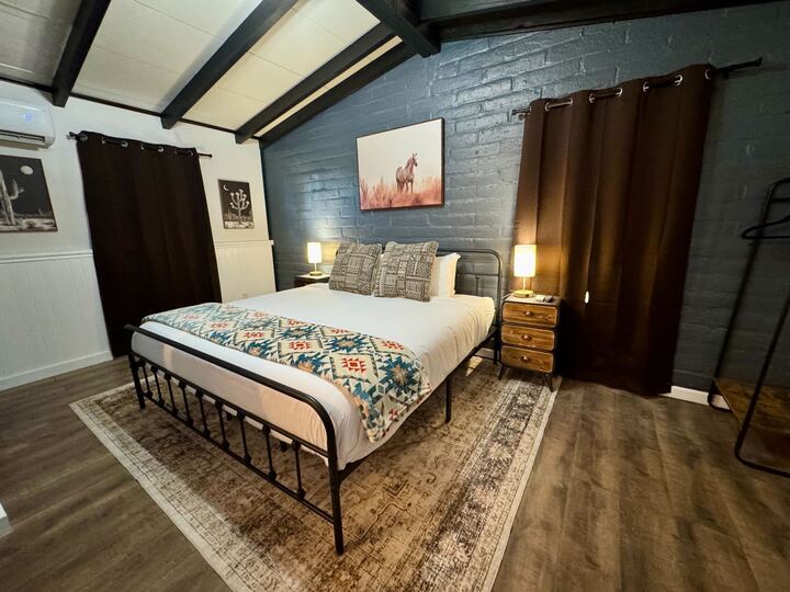 Welcome to the Yucca Room—a quiet desert retreat within JTH Tucson, a 7-room inn. Tucked against the west side of Saguaro National Park, this private suite offers a peaceful base to slow down, reflect, and connect with the beauty of the Sonoran Desert. This is a lower-level room featuring a king bed, private bathroom, fireplace, kitchenette, private patio, and TV. Ideal for up to two adults and one infant—this space blends handcrafted details with the warmth and quiet of desert life.