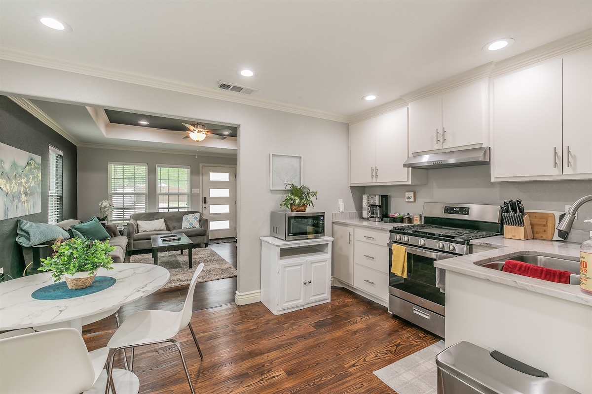 Lo que te gustará ❤️ de tu estancia: - Ubicación céntrica en el corazón de Arlington. - A pocos minutos del estadio AT&T, Texas LIVE, Globe Life Field, Six Flags, Hurricane Harbor, Universidad de Texas en Arlington, Billy Bob's of TX, Famous Stockyards de Fort Worth y aeropuerto DFW. - A 19 minutos a pie del estadio AT&T. - A poca distancia a pie de tiendas, restaurantes y bares. - Fogata/parrilla/comedor al aire libre. - Cocina totalmente equipada (cápsulas/café incluidos). - Internet de alta velocidad. - (3) televisores inteligentes - Lavadora y secadora de tamaño completo.