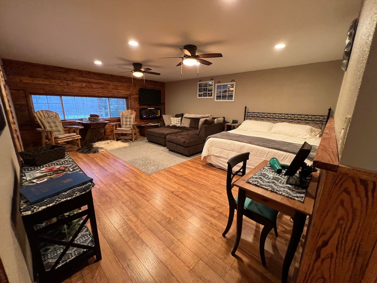 A quaint cowboy decor room on a working horse farm . Great over night room in the country but minutes from town. Full bathroom, fridge, microwave queen size bed. . Rooster lets you know when dawn is approaching . Great stop over if hauling horses . Picnic area at top with grill. Arabian horses dot the pastures. Covered bridge on the road and within minutes of wineries, Lake Erie, Historical Ashtabula harbor. Room is small but comfortable without the noise of a hotel. Wifi but no TV .