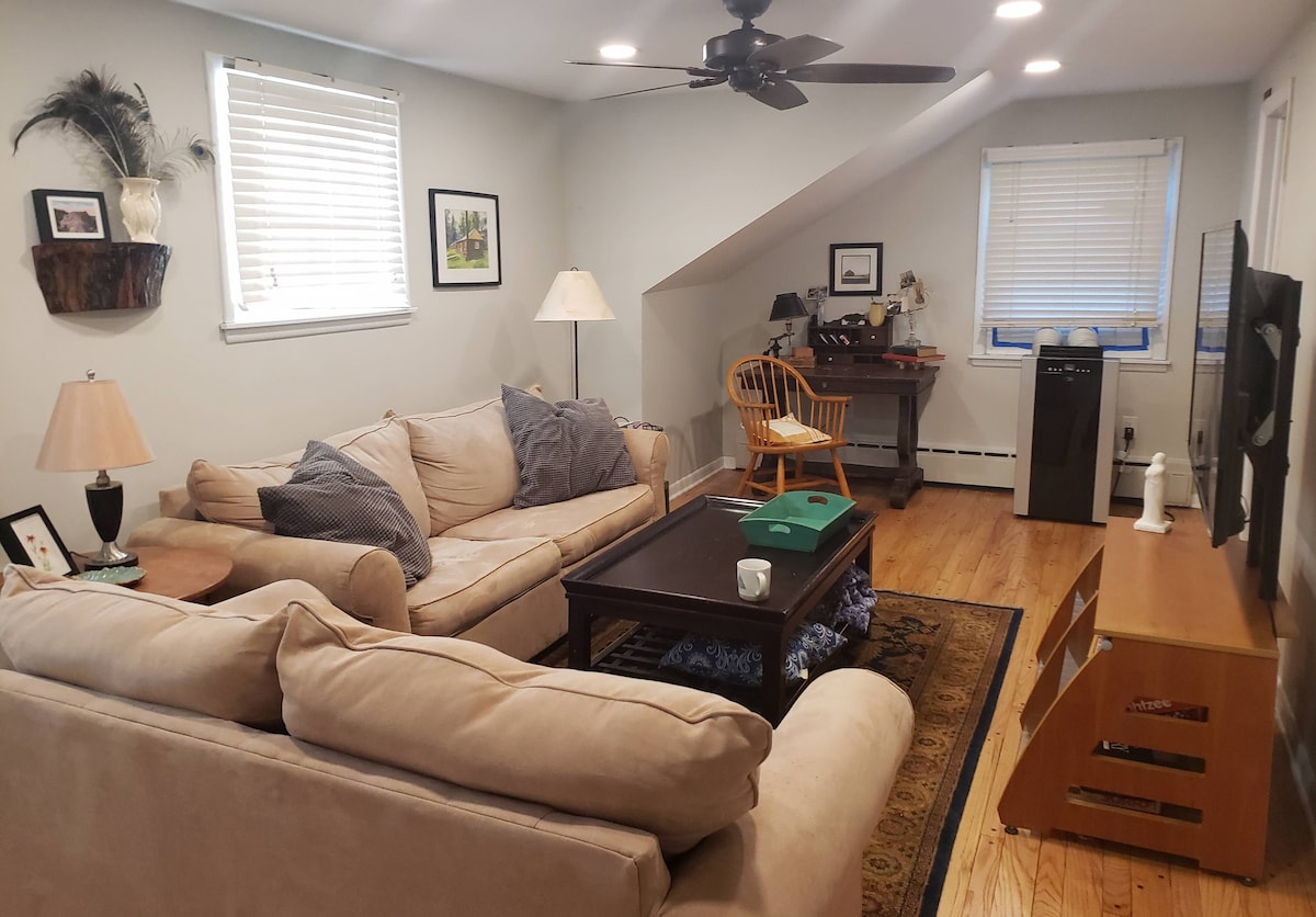 This charming home-apartment provides all of the comforts of a modern home in a cozy setting. It includes refinished oak floors, new appliances, and other stylish finishes. Your private entrance opens to a kitchen with all of the amenities, including a new stainless gas range. Bedrooms are tastefully decorated and quite comfortable. Includes wifi with television and movie subscription services. Dine outdoors with your private picnic table, firepit, & grill in a beautiful, wooded setting.