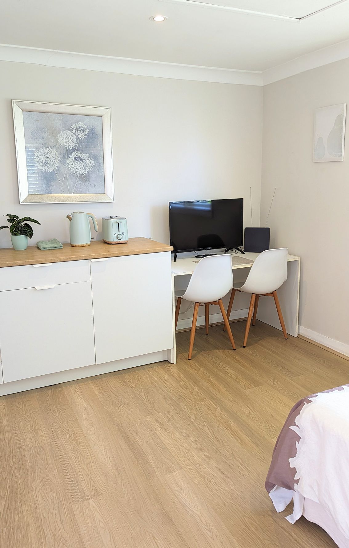 Estudio tranquilo y privado construido con un propósito. Entrada y baño propios. Mobiliario moderno con cama tamaño king y una manta eléctrica en invierno. Ropa de cama y artículos de aseo de lujo. Smart TV, cocina americana con banco de piedra. Aire acondicionado, microondas, tostadora, té/café (instantáneo y Nespresso). Se proporciona un desayuno ligero. Barbacoa y porche privado. Armario. Lavadora nueva. Despiértate con el sonido de los pájaros. LGBTI amigable. Estacionamiento seguro cerrado. Los viajeros de negocios/huéspedes habituales pueden optar a un programa de fidelización.