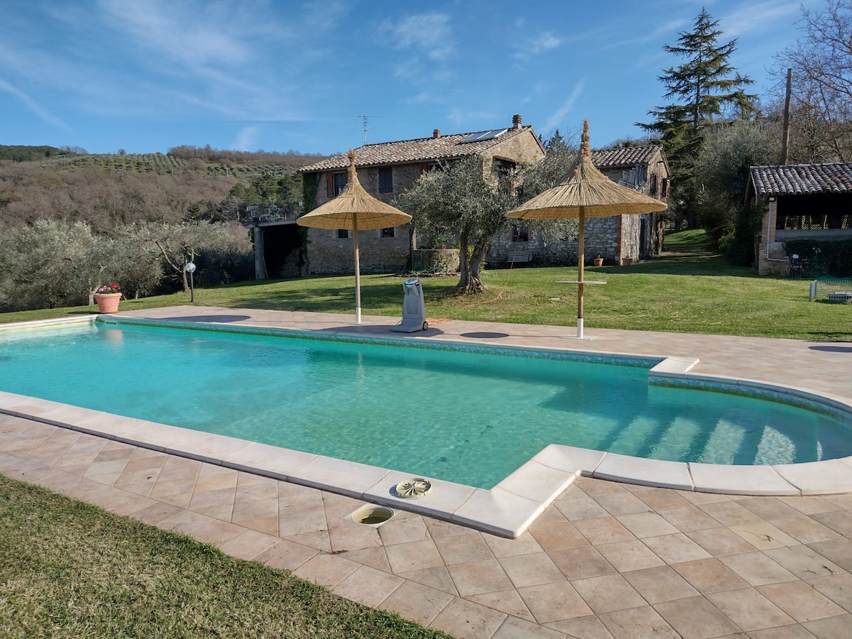 La casa rural fue construida con antigua piedra procedente localmente en Umbría y ofrece una vista impresionante con vistas al valle circundante. La casa abarca una amplia sala de estar con dos chimeneas antiguas, dos cocinas, una sala de recreación, cinco dormitorios y cuatro baños. En el exterior hay una gran piscina, comedor, una casa de juegos para niños, múltiples opciones de aparcamiento y un garaje totalmente cerrado para 2 autos. También hay una barbacoa y un horno de leña si deseas cocinar afuera.