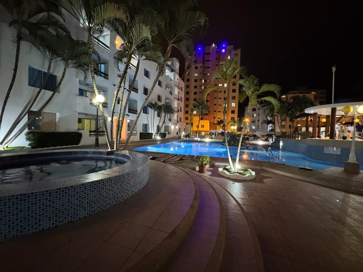 Departamento de Lujo para 9 personas - 2 Dormitorios, Piscina y Más ¡Departamento con AIRE ACONDICIONADO! 2dormitorios 5 camas. Cocina equipada 2 baños Parqueadero privado. Máster cama 2.5 plazas Dormitorio 1 cama 2 plazas en litera arriba 1,5 plazas también encontrarás un sofá cama. En la sala también tienes un sofá cama Tienes TV en cada area Amenidades: piscina, jacuzzi, sauna turco. Perfecto para familias o grupos. A 3 cuadras de la playa ! Conjunto súper privado Seguridad 24/7