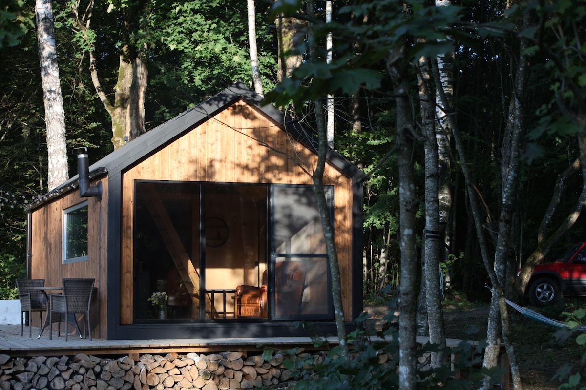 This tiny house fits 5 people and has a huge beautiful terrace in front of the Nava lake for a quiet and relaxing stay with your family or friends surrounded by wild nature just 1 hour away from Vilnius and Kaunas. We have a wooden bridge and a direct access to the lake. Private sauna and an outside hot tub (available for an additional fee with prior reservation).