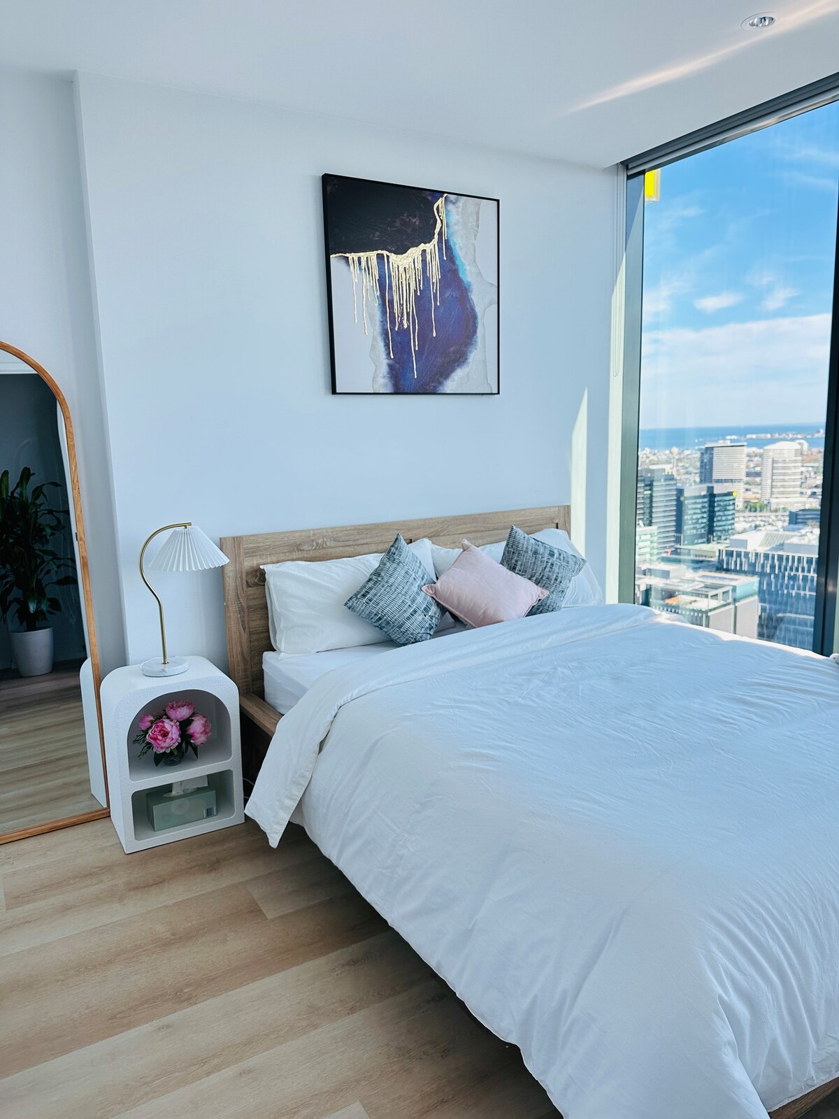 Our lovely apartment is located at one of the top floor of Upper West Side buiding at Spencer St which is only a minute walking from Southern Cross station where you can find the best public transport option to beautiful attractions in Melbourne, including sky bus services to airport Allow yourself exploring the Melbourne city by walking or free tram at the front of the building to main attractions such as Crown Casino, Dockland, Aquarium and much more. Parking can be booked for $25/day