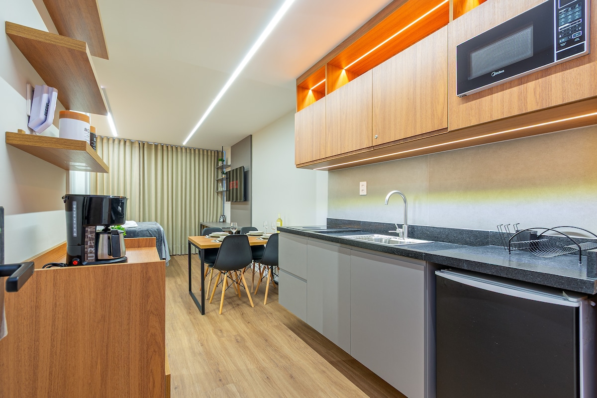 Viva uma experiência única neste estúdio acolhedor e elegante, projetado com atenção aos detalhes para oferecer conforto, funcionalidade e muito estilo. O ap azul planejado é um diferencial exclusivo, com iluminação suave e decoração pensada para relaxar, móvel inteligente e versátil que se transforma em mesa de jantar ou apoio para cozinhar — perfeito para quem valoriza funcionalidade. Piano digital disponível para relaxar, praticar ou se inspirar. Smart TV, Wi-Fi.