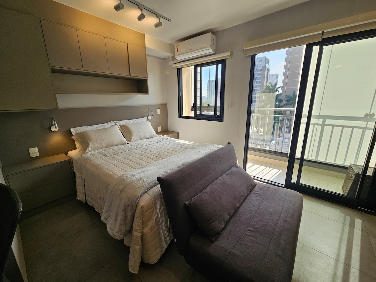Estudio nuevo, muy bien decorado y equipado, con todas las comodidades necesarias para su estancia. Totalmente automatizado, cómodo, acogedor. El edificio es moderno con una excelente infraestructura de ocio: piscina, gimnasio, salón de fiestas con bar, coworking, lavandería y bicicletero. Tiene vista verde a la plaza, la calle es tranquila y de fácil acceso. Está ubicado entre los barrios de Moema, Brooklin y Vila Olimpia, a 5 minutos del Shopping Ibirapuera ya 15 del Aeropuerto de Congonhas.